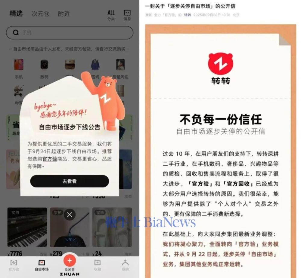 但这种常年“保二争一”的尴尬处境,让转转追赶闲鱼无望,也保不住利润。为此,转转逐渐从C2C(用户间交易,闲鱼主要是这种模式)转型C2B2C(在用户间多了个中间商),并在昨日发布公告,宣布将关停旗下C2C模式的“自由市场”业务,9月24日开始关闭商品发布入口,10月31日正式关闭所有业务,100%投入C2B2C模式的二手“官方验”业务。